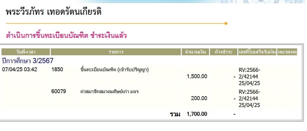 สถานะเข้าพิธีประสาทปริญญา : บรรพชิต ระดับ : ปริญญาตรี สังกัดคณะ: คณะสังคมศาสตร์ สาขาวิชา: รัฐศาสตรบัณฑิต