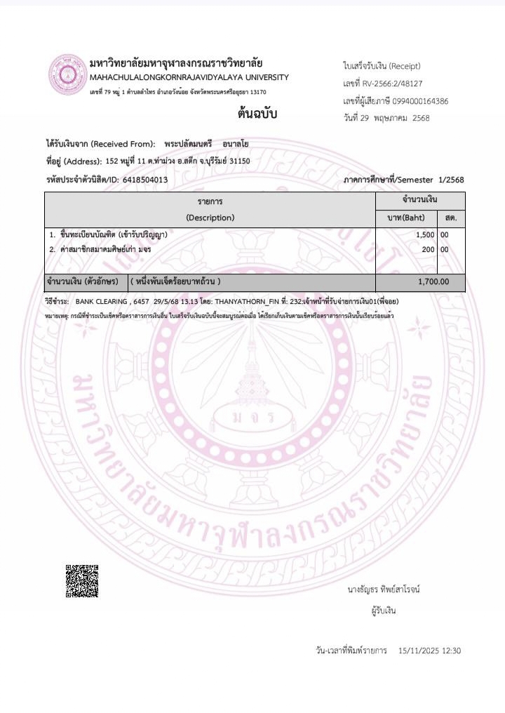 | สถานะเข้าพิธีประสาทปริญญา : บรรพชิต | ระดับ : ปริญญาตรี | สังกัดคณะ: คณะสังคมศาสตร์ | สาขาวิชา: รัฐศาสตรบัณฑิต |
