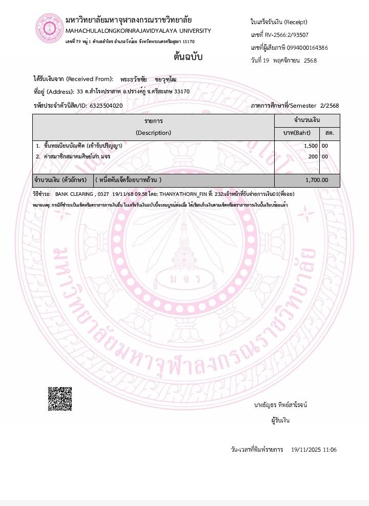 สถานะเข้าพิธีประสาทปริญญา : บรรพชิต ระดับ : ปริญญาตรี สังกัดคณะ: คณะสังคมศาสตร์ สาขาวิชา: รัฐศาสตรบัณฑิต