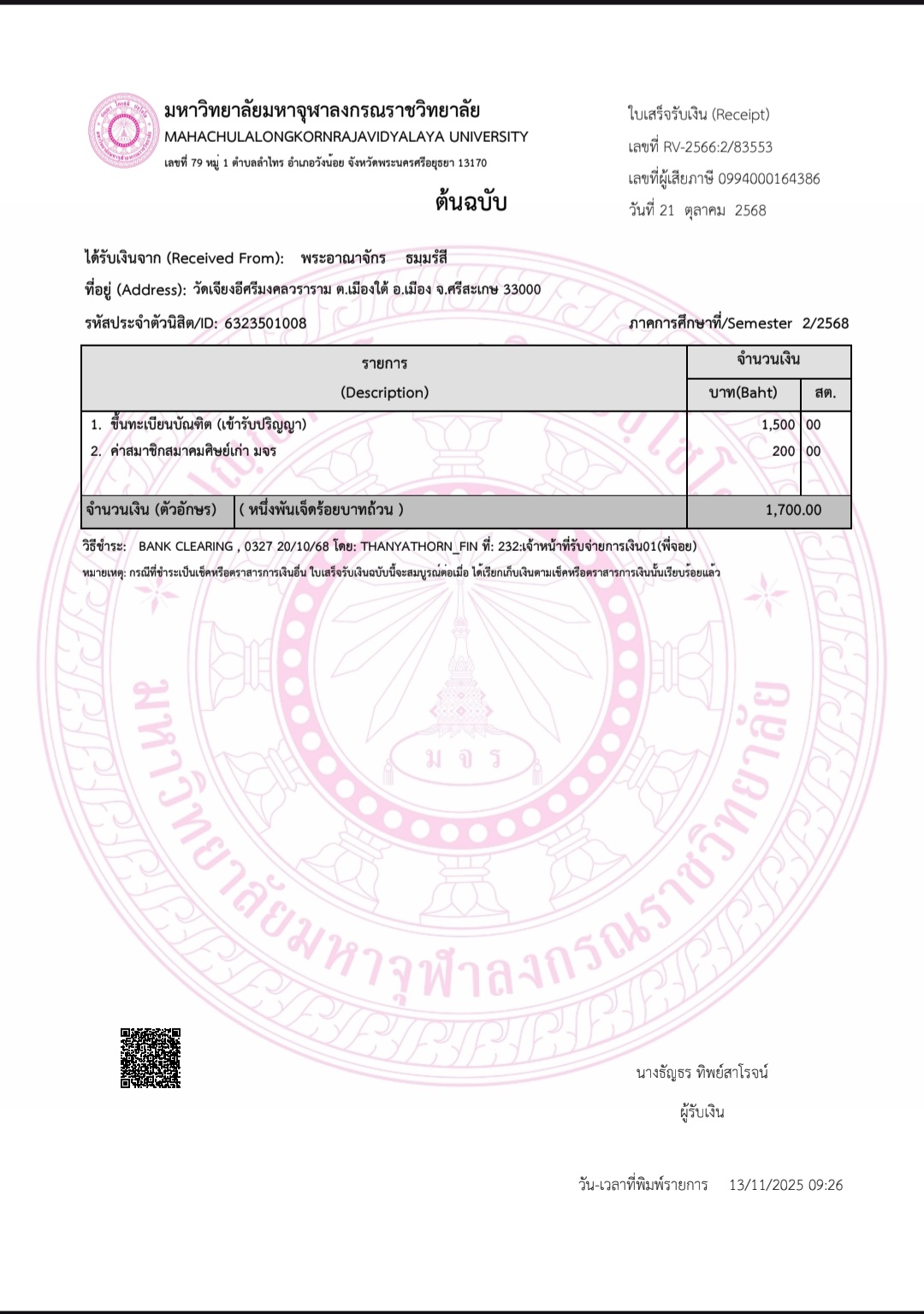 | สถานะเข้าพิธีประสาทปริญญา : บรรพชิต | ระดับ : ปริญญาตรี | สังกัดคณะ: คณะสังคมศาสตร์ | สาขาวิชา: รัฐศาสตรบัณฑิต |