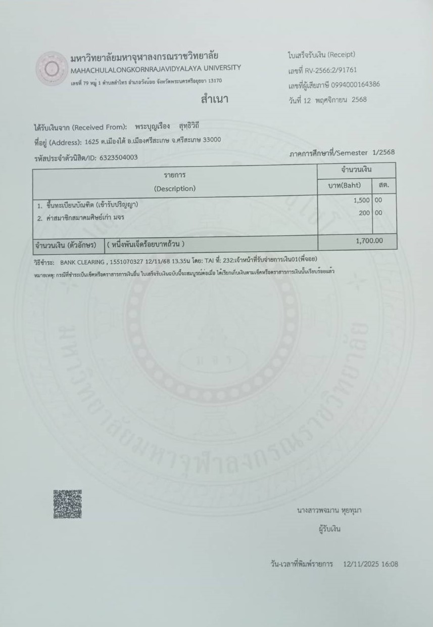 สถานะเข้าพิธีประสาทปริญญา : บรรพชิต ระดับ : ปริญญาตรี สังกัดคณะ: คณะสังคมศาสตร์ สาขาวิชา: การจัดการเชิงพุทธ