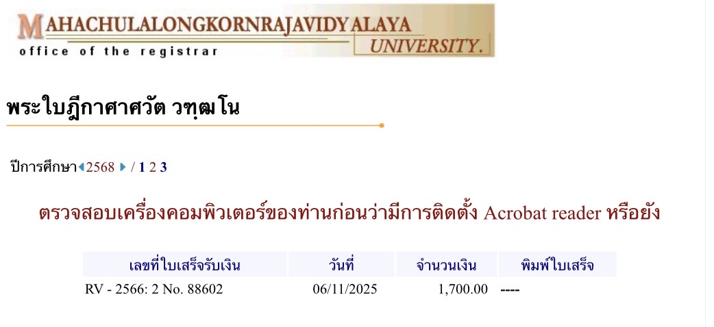 | สถานะเข้าพิธีประสาทปริญญา : บรรพชิต | ระดับ : ปริญญาตรี | สังกัดคณะ: คณะสังคมศาสตร์ | สาขาวิชา: รัฐประศาสนศาสตรบัณฑิต |