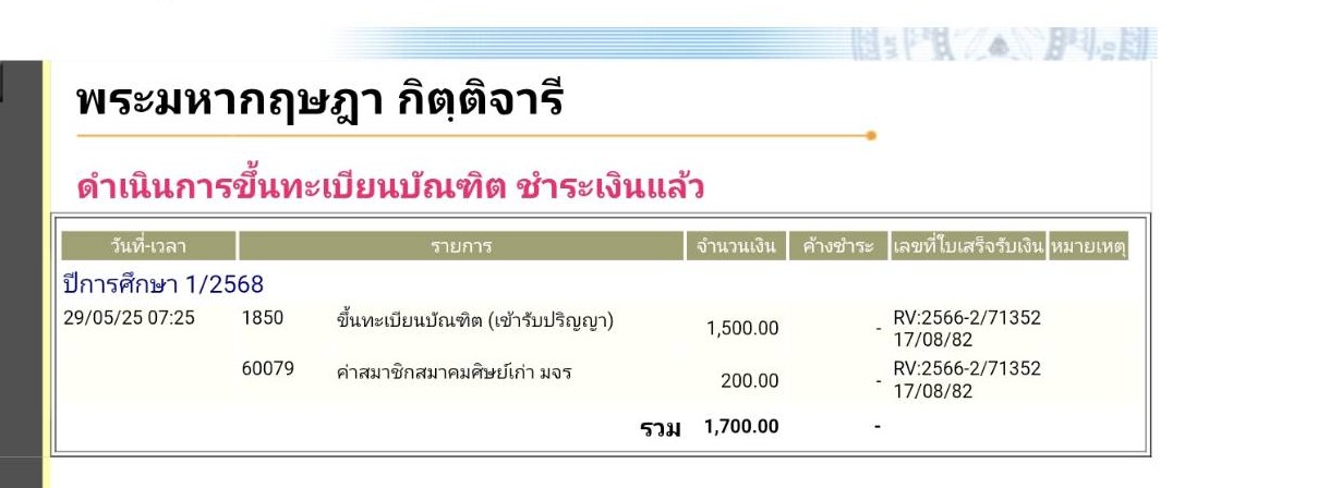 | สถานะเข้าพิธีประสาทปริญญา : บรรพชิต | ระดับ : ปริญญาตรี | สังกัดคณะ: คณะสังคมศาสตร์ | สาขาวิชา: การจัดการเชิงพุทธ |
