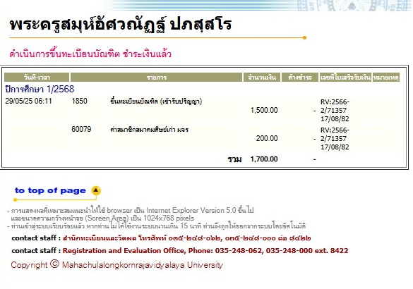 | สถานะเข้าพิธีประสาทปริญญา : บรรพชิต | ระดับ : ปริญญาตรี | สังกัดคณะ: คณะสังคมศาสตร์ | สาขาวิชา: การจัดการเชิงพุทธ |