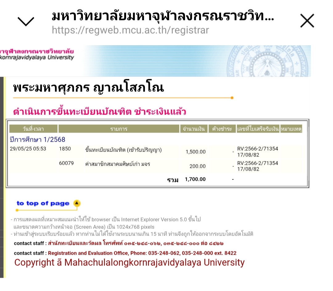 | สถานะเข้าพิธีประสาทปริญญา : บรรพชิต | ระดับ : ปริญญาตรี | สังกัดคณะ: คณะสังคมศาสตร์ | สาขาวิชา: การจัดการเชิงพุทธ |