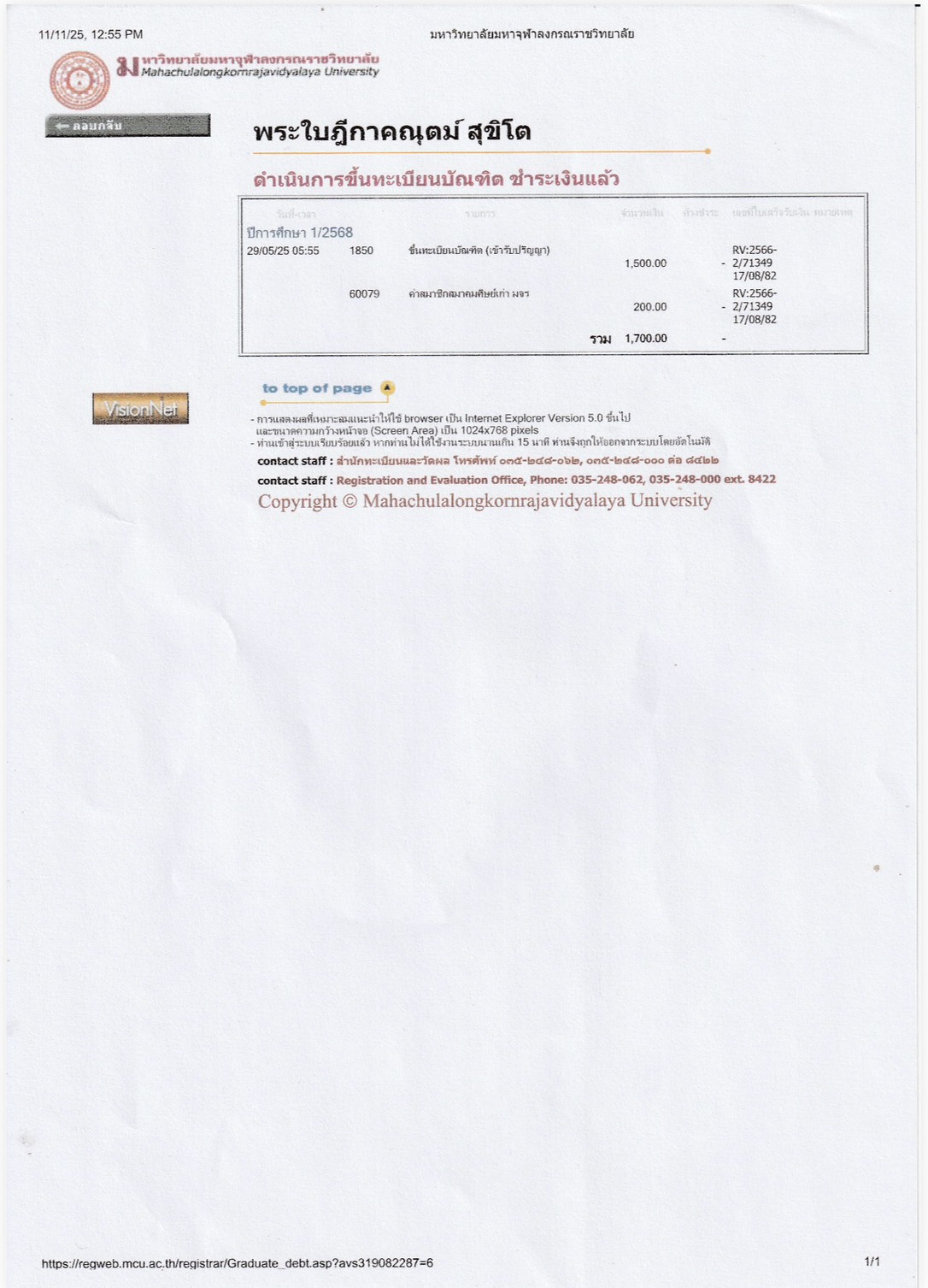 | สถานะเข้าพิธีประสาทปริญญา : บรรพชิต | ระดับ : ปริญญาตรี | สังกัดคณะ: คณะสังคมศาสตร์ | สาขาวิชา: การจัดการเชิงพุทธ |