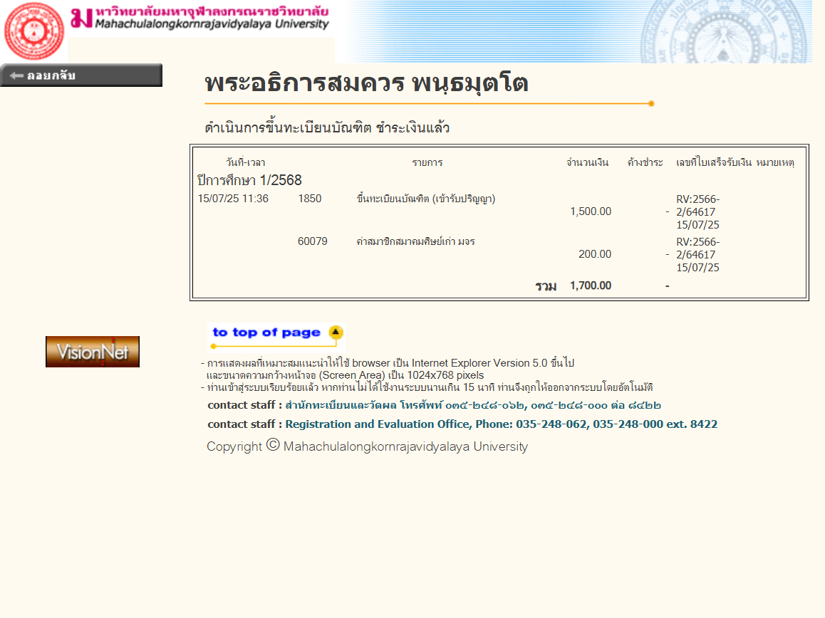 | สถานะเข้าพิธีประสาทปริญญา : บรรพชิต | ระดับ : ปริญญาตรี | สังกัดคณะ: คณะสังคมศาสตร์ | สาขาวิชา: การจัดการเชิงพุทธ |