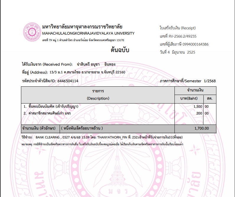 | สถานะเข้าพิธีประสาทปริญญา : บรรพชิต | ระดับ : ปริญญาตรี | สังกัดคณะ: คณะสังคมศาสตร์ | สาขาวิชา: การจัดการเชิงพุทธ |
