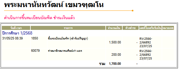 สถานะเข้าพิธีประสาทปริญญา : บรรพชิต ระดับ : ปริญญาตรี สังกัดคณะ: คณะสังคมศาสตร์ สาขาวิชา: การจัดการเชิงพุทธ