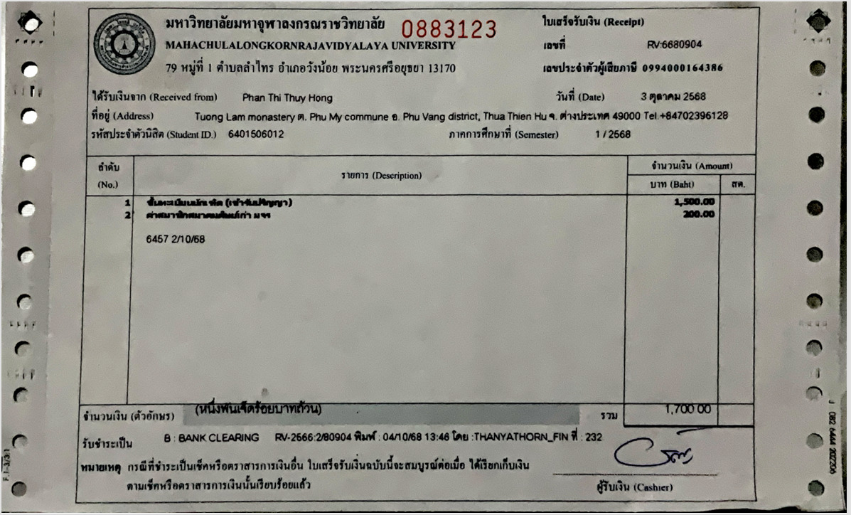 | สถานะเข้าพิธีประสาทปริญญา : คฤหัสถ์ | ระดับ : ปริญญาตรี | สังกัดคณะ: คณะพุทธศาสตร์ | สาขาวิชา: Buddhist Studies |