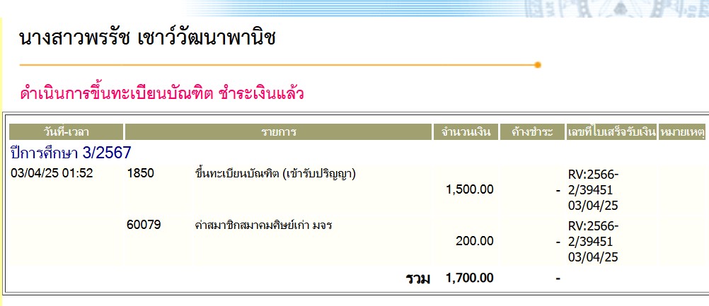 | รหัสนิสิต : 6312501021 | ชื่อ : นางสาวพรรัช | ฉายา: - | นามสกุล: เชาว์วัฒนาพานิช |
