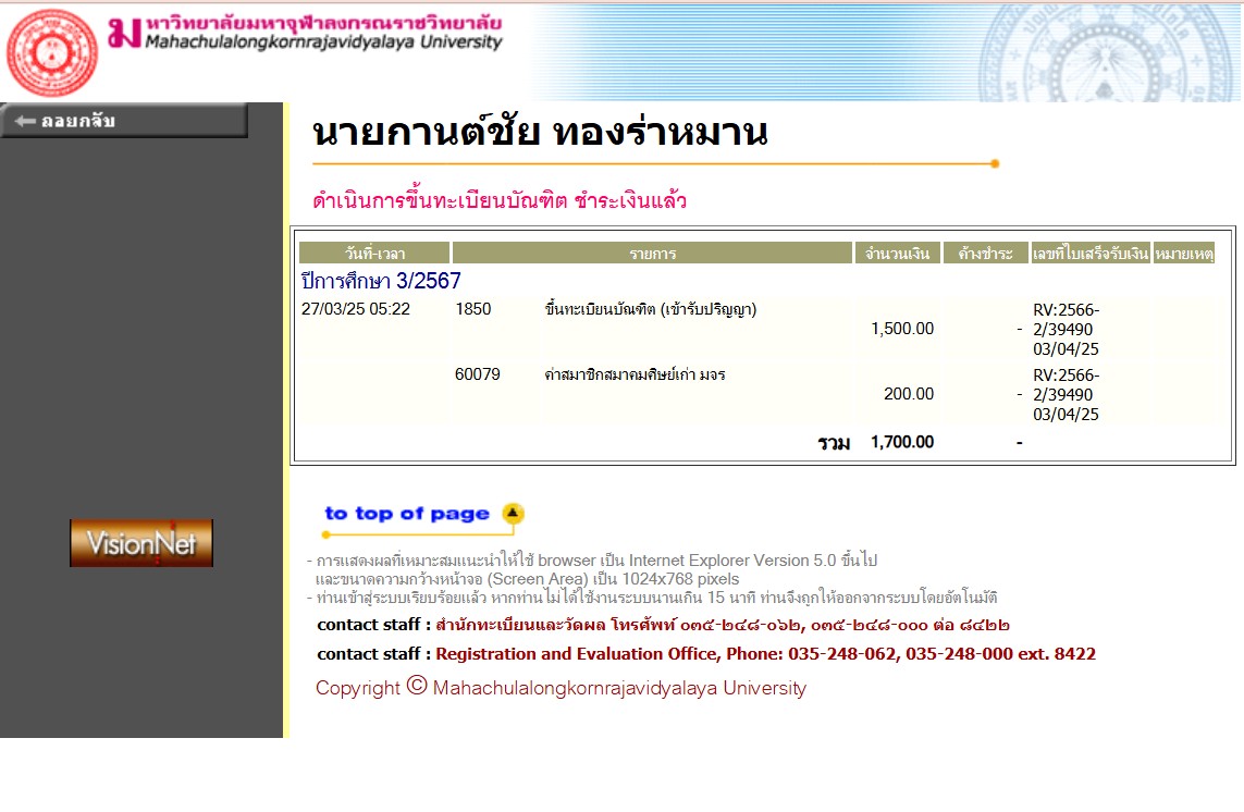 | สถานะเข้าพิธีประสาทปริญญา : คฤหัสถ์ | ระดับ : ปริญญาตรี | สังกัดคณะ: คณะสังคมศาสตร์ | สาขาวิชา: รัฐศาสตรบัณฑิต |