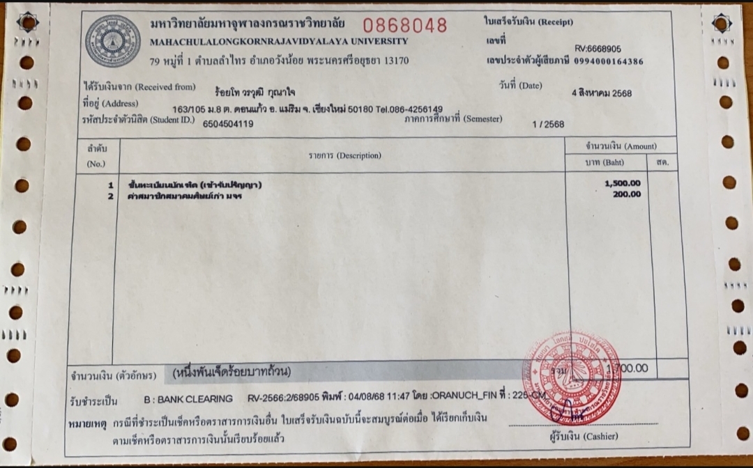 ใบเสร็จรับเงิน/เอกสารยืนยันการชำระเงิน(แนบเอกสาร)