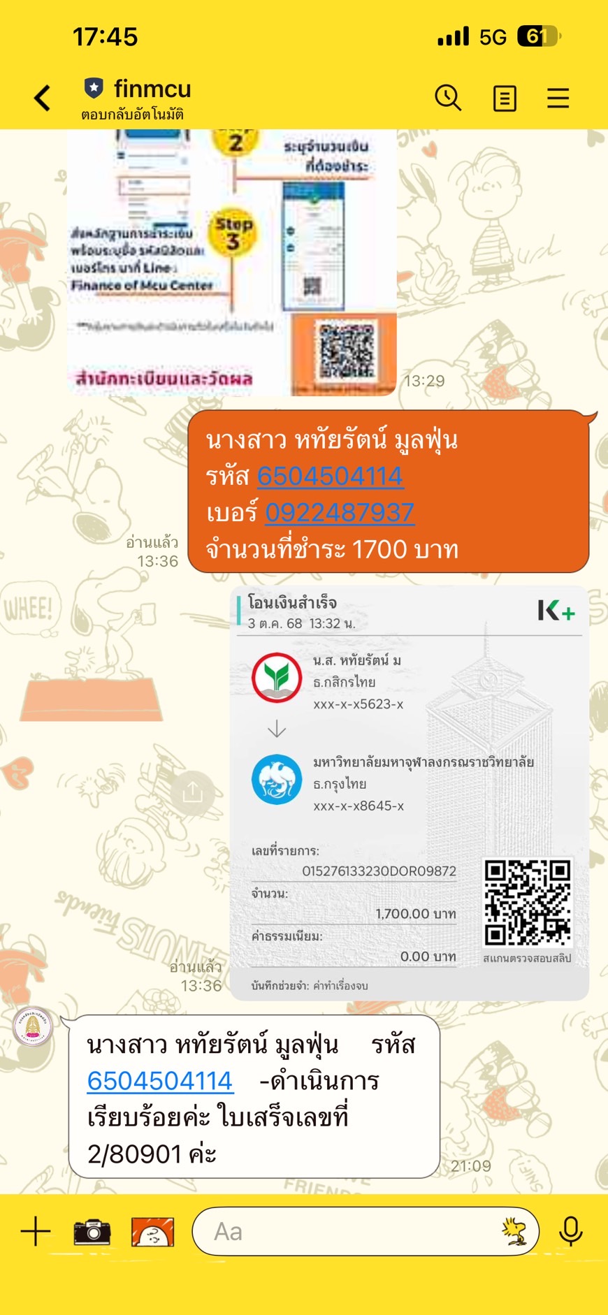 | รหัสนิสิต : 6504504114 | ชื่อ : นางสาวหทัยรัตน์ | ฉายา: - | นามสกุล: มูลฟุ่น |