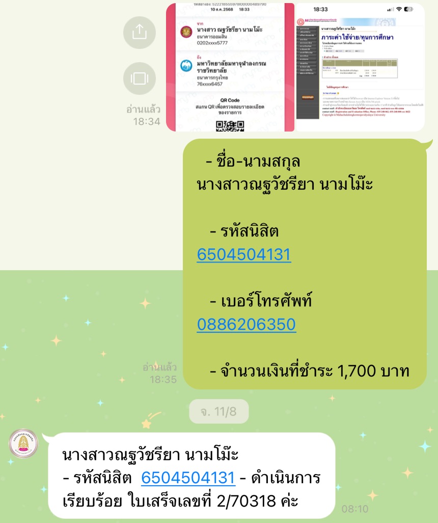 | รหัสนิสิต : 6504504131 | ชื่อ : นางสาวณฐวัชรียา | ฉายา: - | นามสกุล: นามโม๊ะ |
