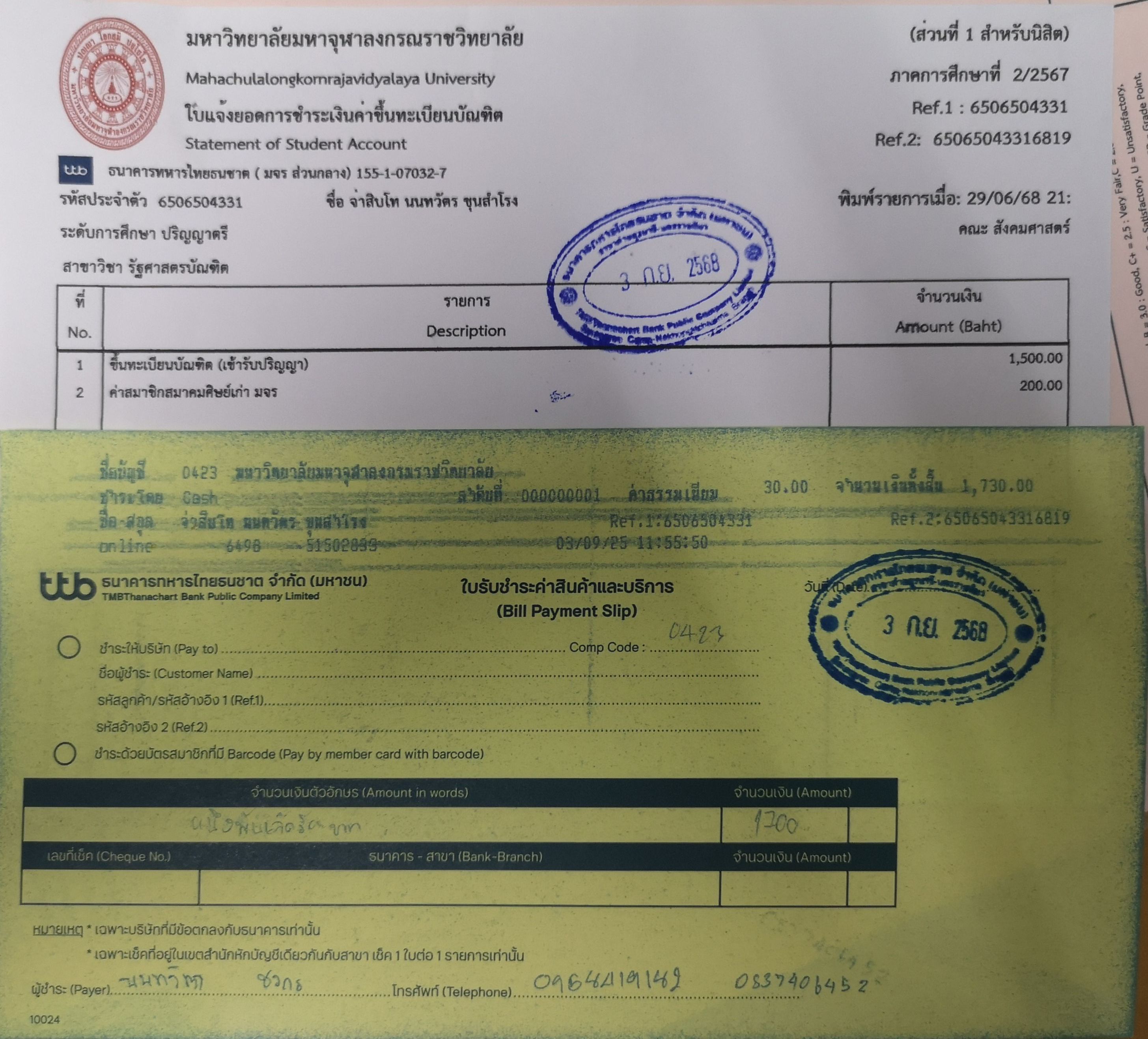 | สถานะเข้าพิธีประสาทปริญญา : คฤหัสถ์ | ระดับ : ปริญญาตรี | สังกัดคณะ: คณะสังคมศาสตร์ | สาขาวิชา: รัฐศาสตรบัณฑิต |