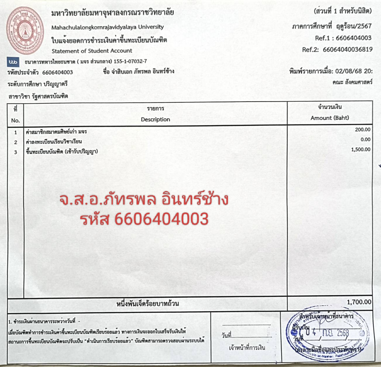 รหัสนิสิต : 6606404003 ชื่อ : จ่าสิบเอก ภัทรพล ฉายา: - นามสกุล: อินทร์ช้าง