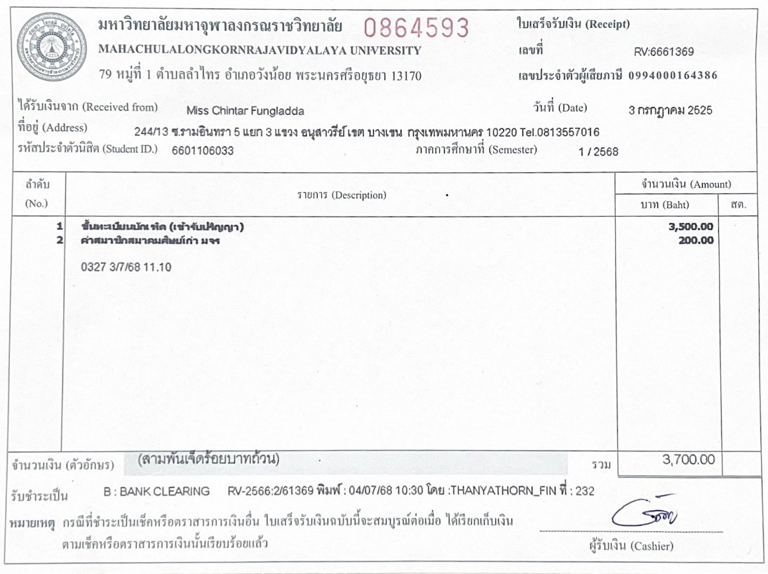 | รหัสนิสิต : 6601106033 | ชื่อ : Miss Chintar | ฉายา: - | นามสกุล: Fungladda |