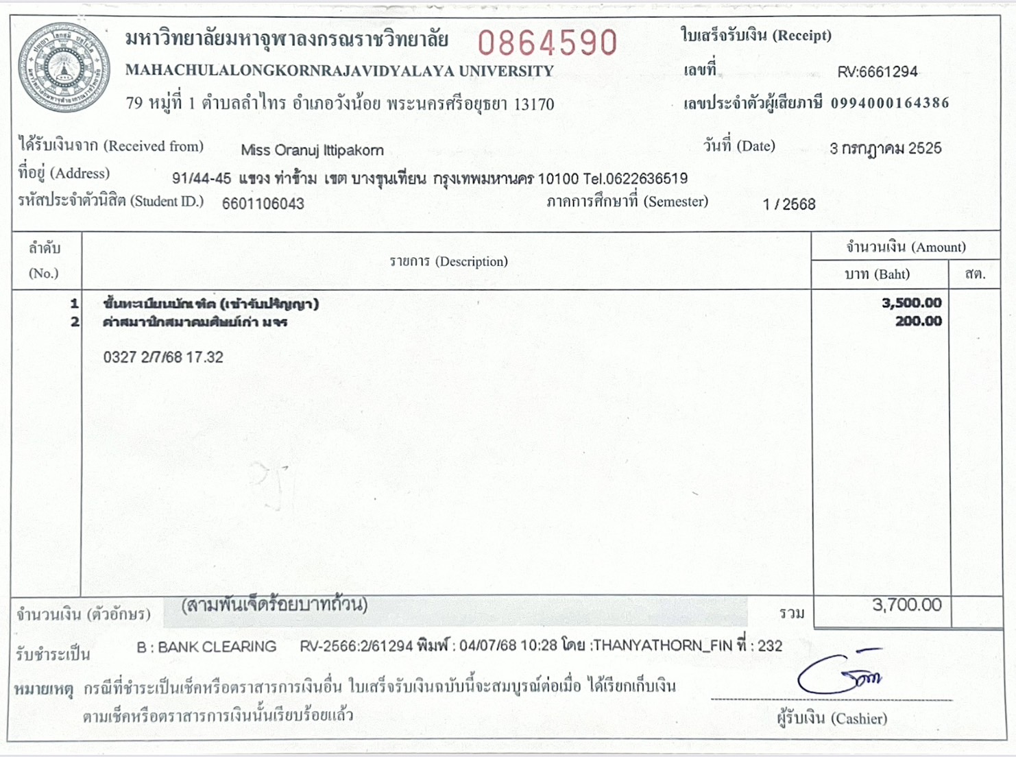 | รหัสนิสิต : 6601106043 | ชื่อ : Miss Oranuj | ฉายา: - | นามสกุล: Ittipakorn |