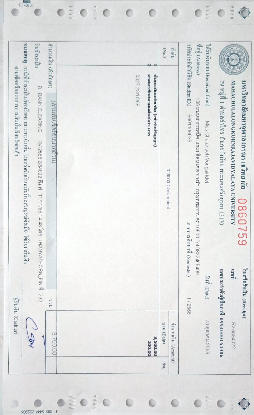 | รหัสนิสิต : 6601106035 | ชื่อ : Miss Chutanuch | ฉายา: - | นามสกุล: Vongsiridej |