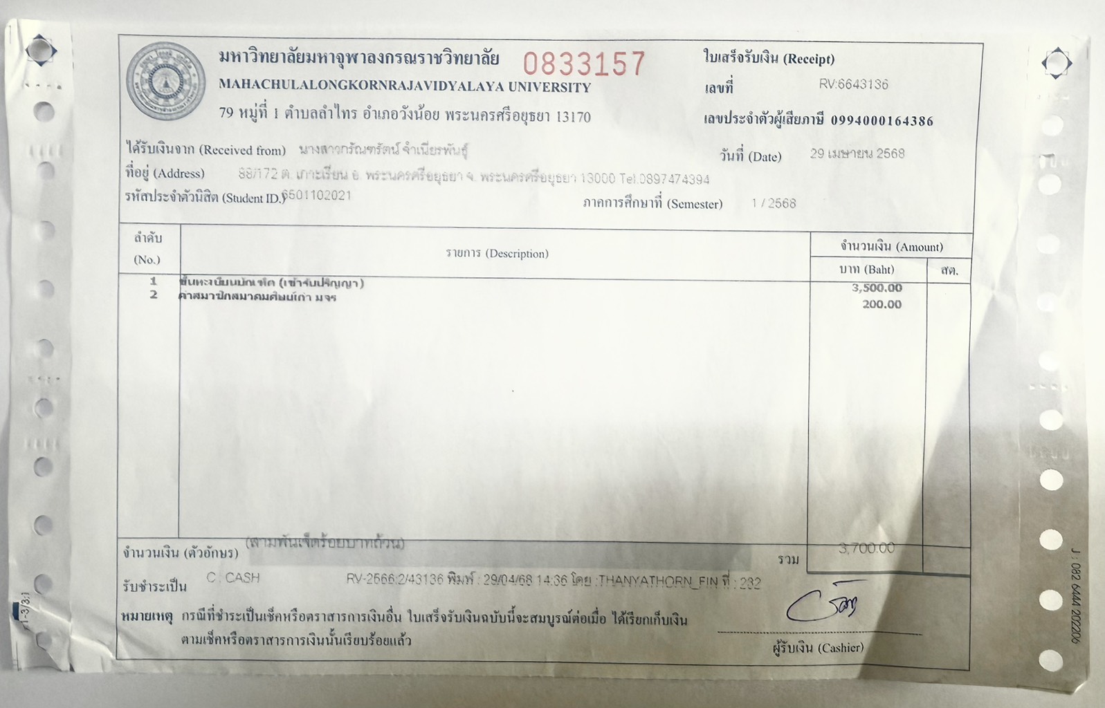 | รหัสนิสิต : 6501102021 | ชื่อ : นางสาวกรัณฑรัตน์ | ฉายา: - | นามสกุล: จำเนียรพันธุ์ |