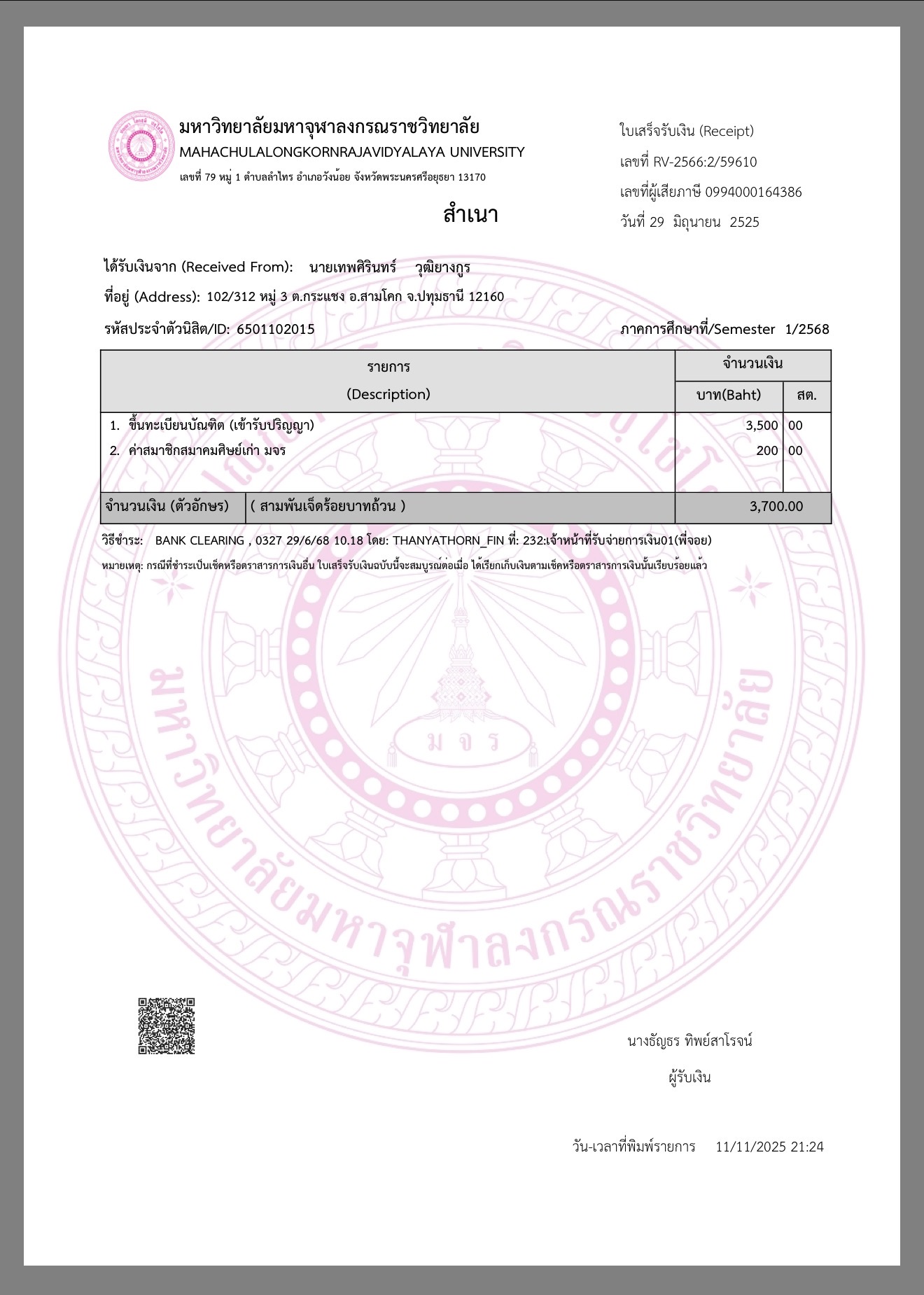 | รหัสนิสิต : 6501102015 | ชื่อ : นายเทพศิรินทร์ | ฉายา: - | นามสกุล: วุฒิยางกูร |