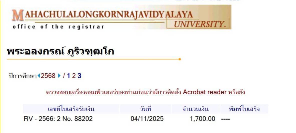 สถานะเข้าพิธีประสาทปริญญา : บรรพชิต ระดับ : ปริญญาตรี สังกัดคณะ: คณะพุทธศาสตร์ สาขาวิชา: พระพุทธศาสนา