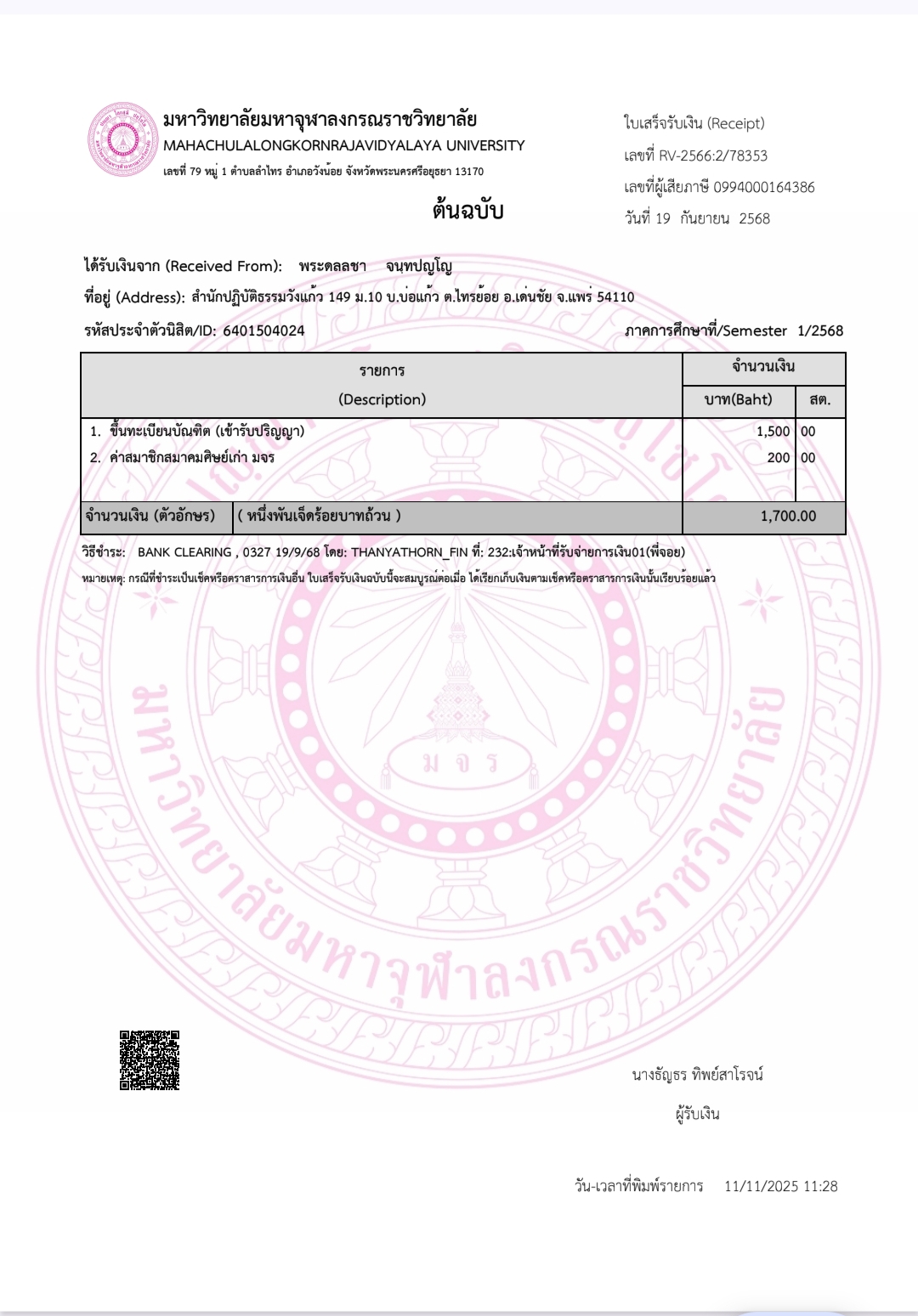 | สถานะเข้าพิธีประสาทปริญญา : บรรพชิต | ระดับ : ปริญญาตรี | สังกัดคณะ: คณะสังคมศาสตร์ | สาขาวิชา: รัฐศาสตรบัณฑิต |