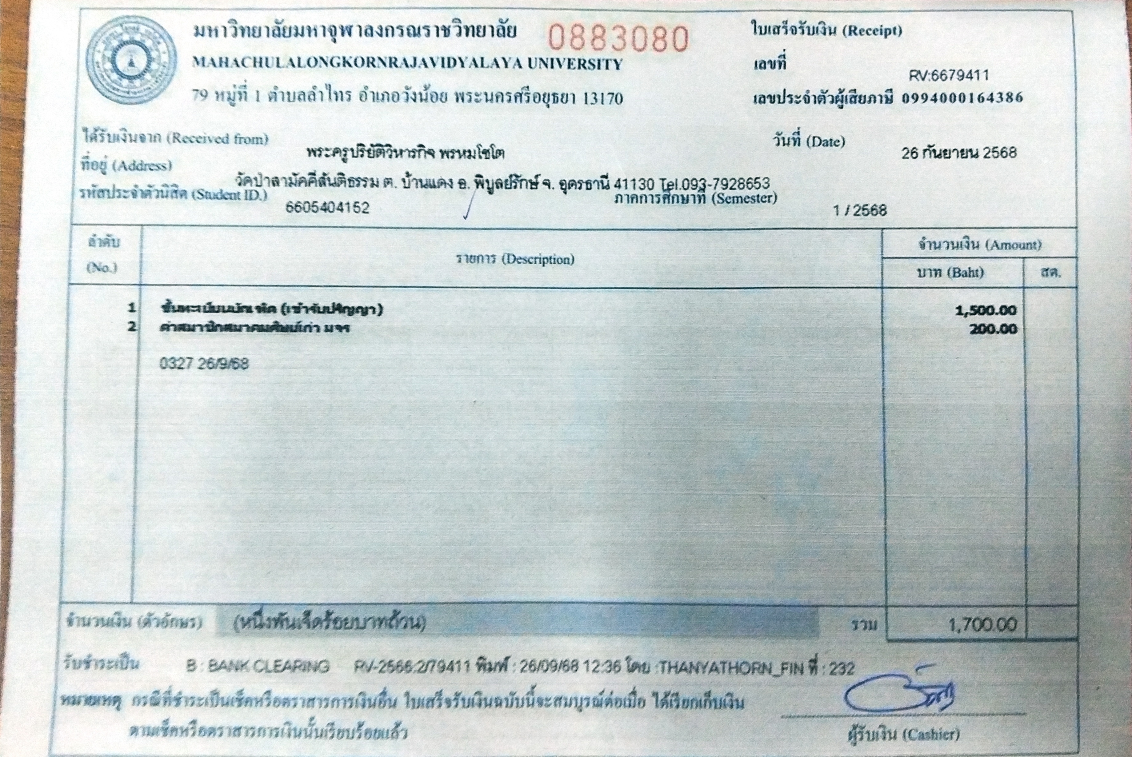 | สถานะเข้าพิธีประสาทปริญญา : บรรพชิต | ระดับ : ปริญญาตรี | สังกัดคณะ: คณะสังคมศาสตร์ | สาขาวิชา: นิติศาสตรบัณฑิต |