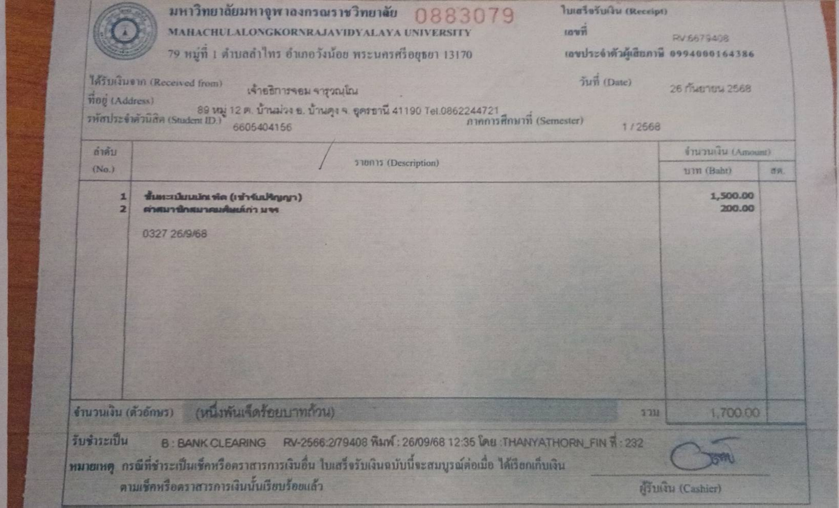 ใบเสร็จรับเงิน/เอกสารยืนยันการชำระเงิน(แนบเอกสาร)
