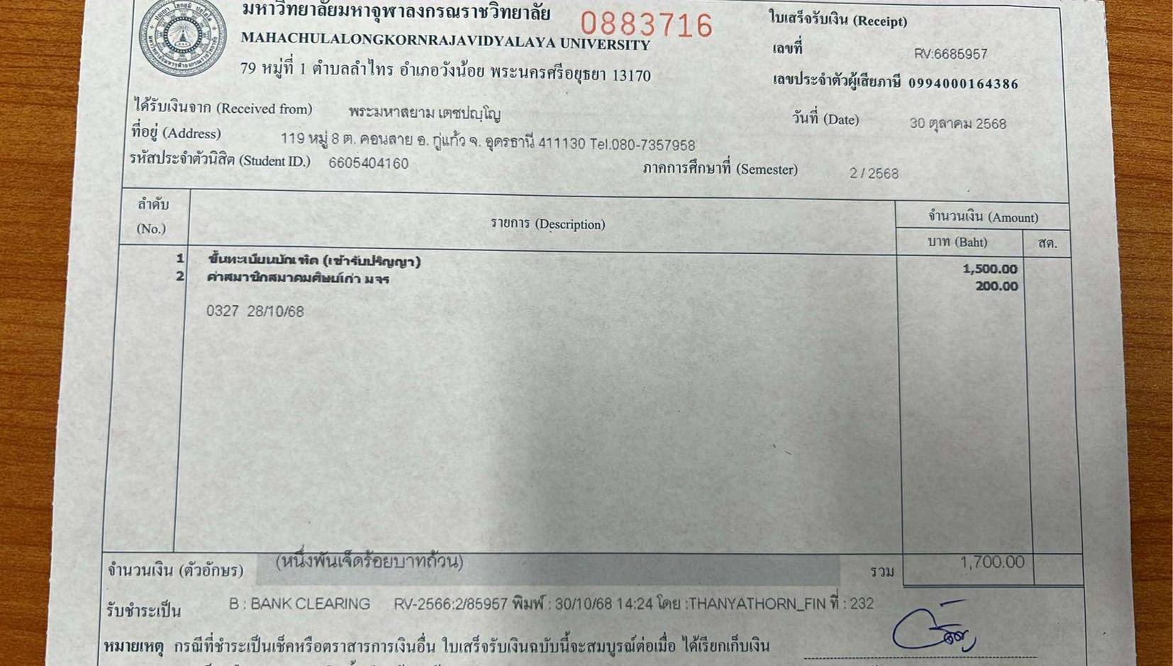 รหัสนิสิต : 6605404160 ชื่อ : พระมหาสยาม ฉายา: เตชปญฺโญ นามสกุล: ยอดจันทร์