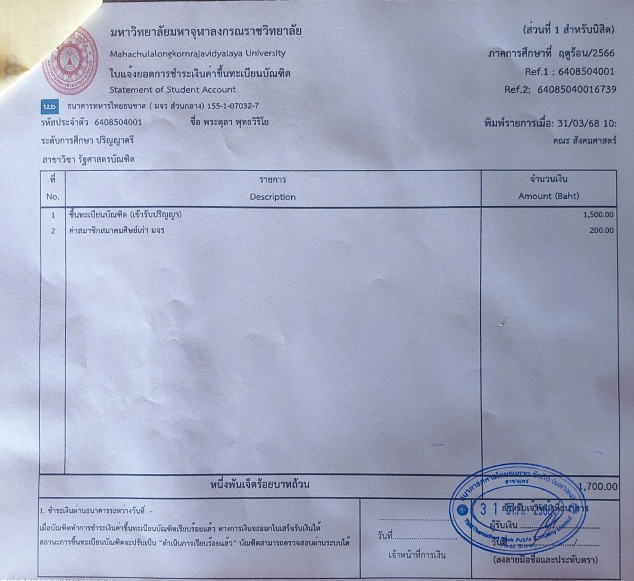 | สถานะเข้าพิธีประสาทปริญญา : บรรพชิต | ระดับ : ปริญญาตรี | สังกัดคณะ: คณะสังคมศาสตร์ | สาขาวิชา: รัฐศาสตรบัณฑิต |