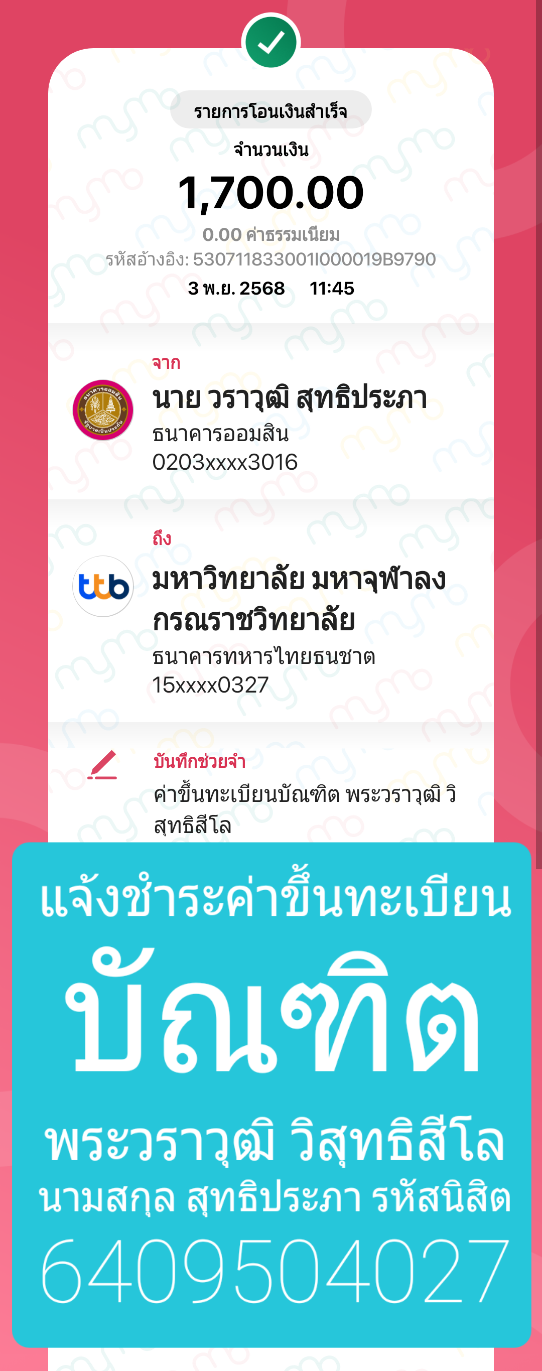 | สถานะเข้าพิธีประสาทปริญญา : บรรพชิต | ระดับ : ปริญญาตรี | สังกัดคณะ: คณะสังคมศาสตร์ | สาขาวิชา: รัฐประศาสนศาสตรบัณฑิต |