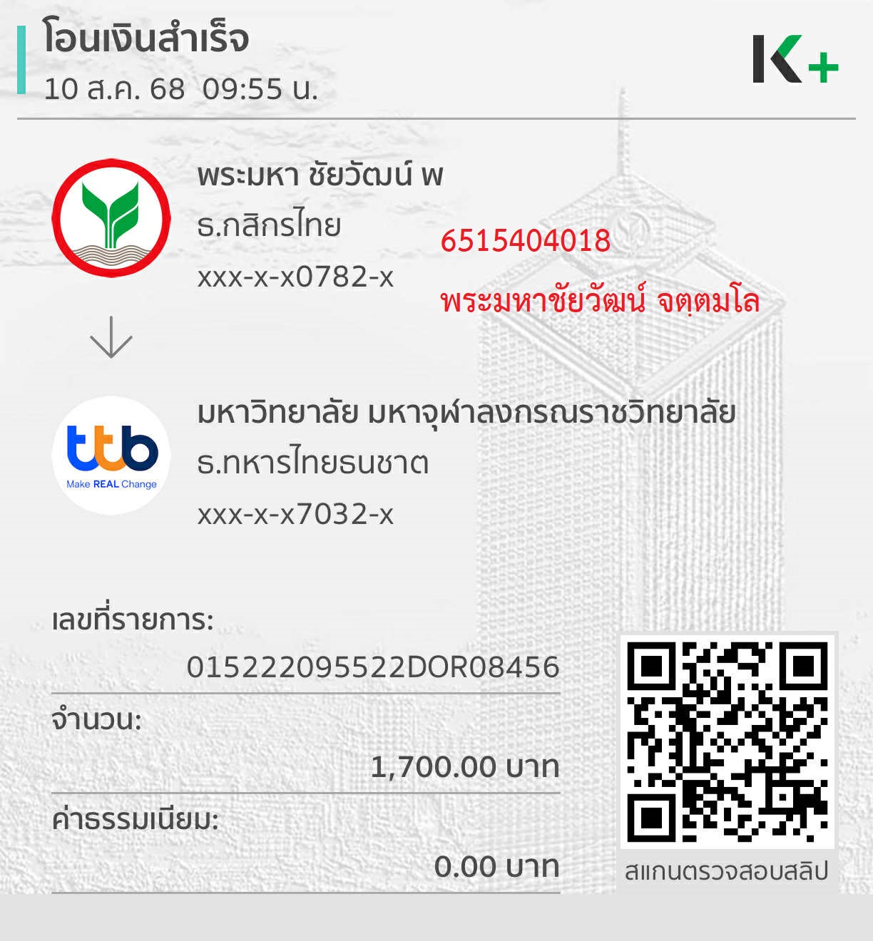 รหัสนิสิต : 6515404018 ชื่อ : พระมหาชัยวัฒน์ ฉายา: จตฺตมโล นามสกุล: พรหมสนธิ