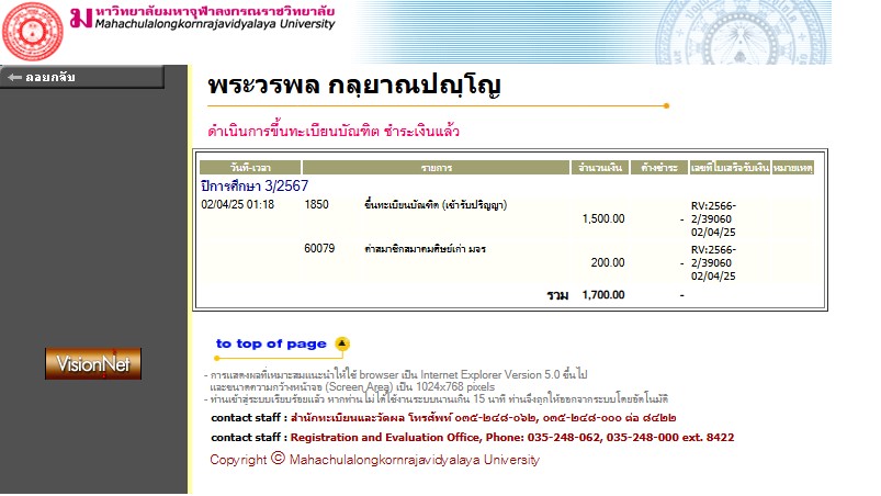 | สถานะเข้าพิธีประสาทปริญญา : บรรพชิต | ระดับ : ปริญญาตรี | สังกัดคณะ: คณะพุทธศาสตร์ | สาขาวิชา: วิปัสสนาภาวนา |