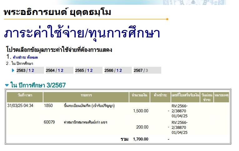 สถานะเข้าพิธีประสาทปริญญา : บรรพชิต ระดับ : ปริญญาตรี สังกัดคณะ: คณะพุทธศาสตร์ สาขาวิชา: พระพุทธศาสนา