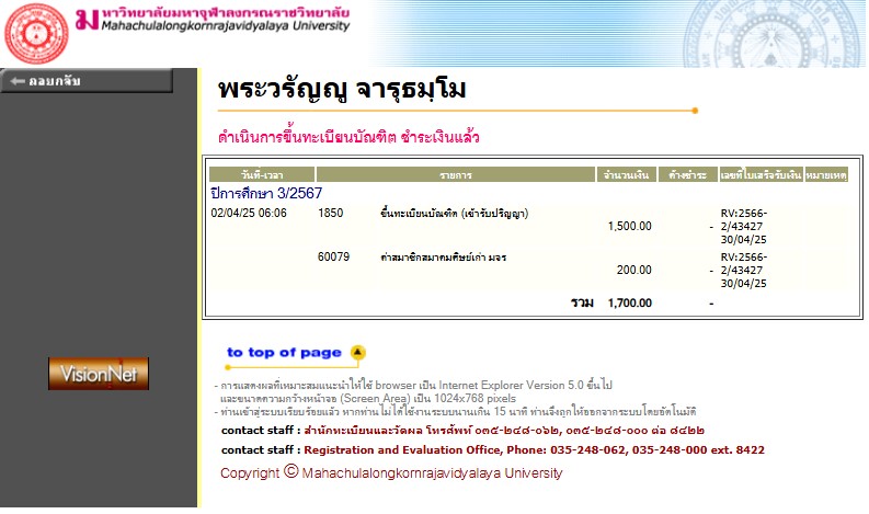 | สถานะเข้าพิธีประสาทปริญญา : บรรพชิต | ระดับ : ปริญญาตรี | สังกัดคณะ: คณะพุทธศาสตร์ | สาขาวิชา: พระพุทธศาสนา |