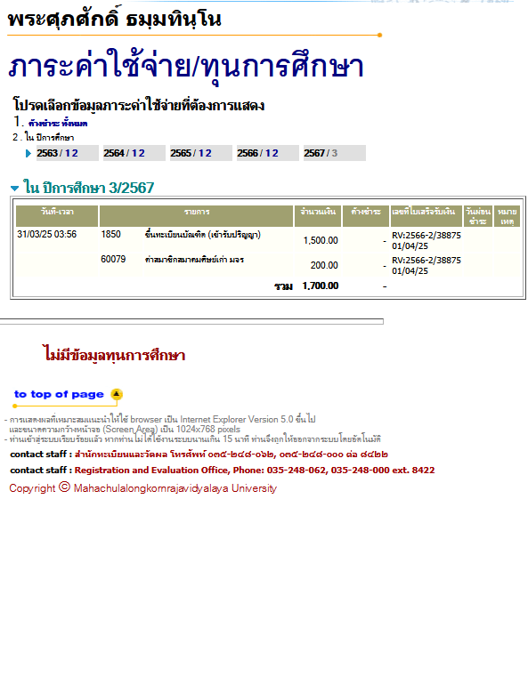 สถานะเข้าพิธีประสาทปริญญา : บรรพชิต ระดับ : ปริญญาตรี สังกัดคณะ: คณะพุทธศาสตร์ สาขาวิชา: พระพุทธศาสนา