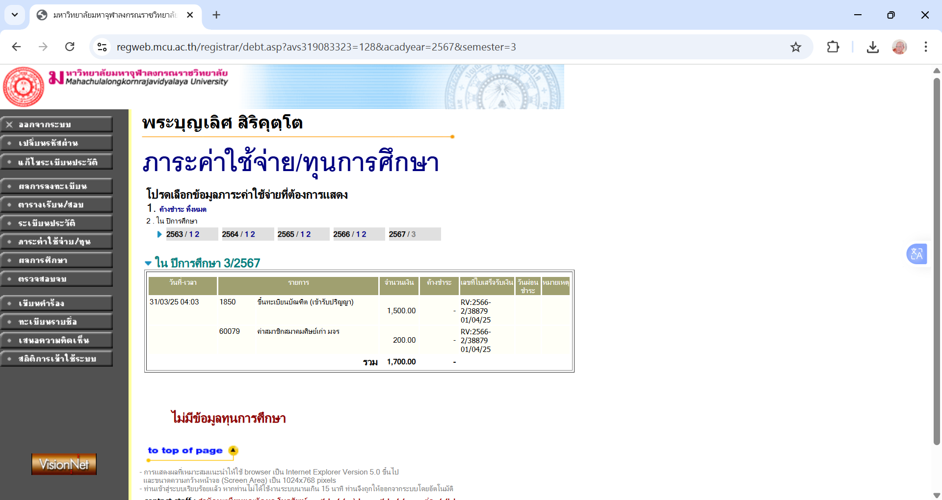 | สถานะเข้าพิธีประสาทปริญญา : บรรพชิต | ระดับ : ปริญญาตรี | สังกัดคณะ: คณะพุทธศาสตร์ | สาขาวิชา: พระพุทธศาสนา |