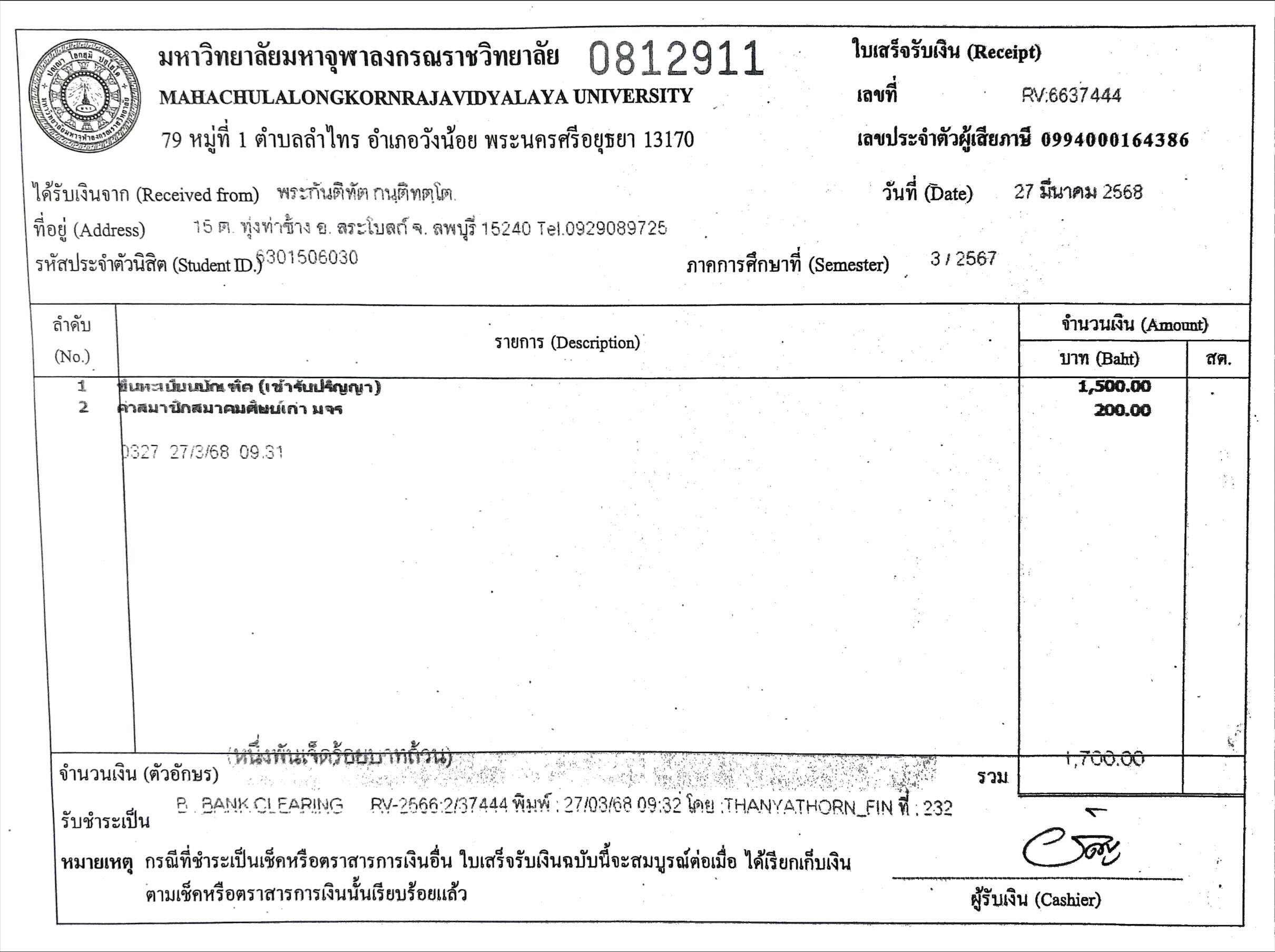 ใบเสร็จรับเงิน/เอกสารยืนยันการชำระเงิน(แนบเอกสาร)