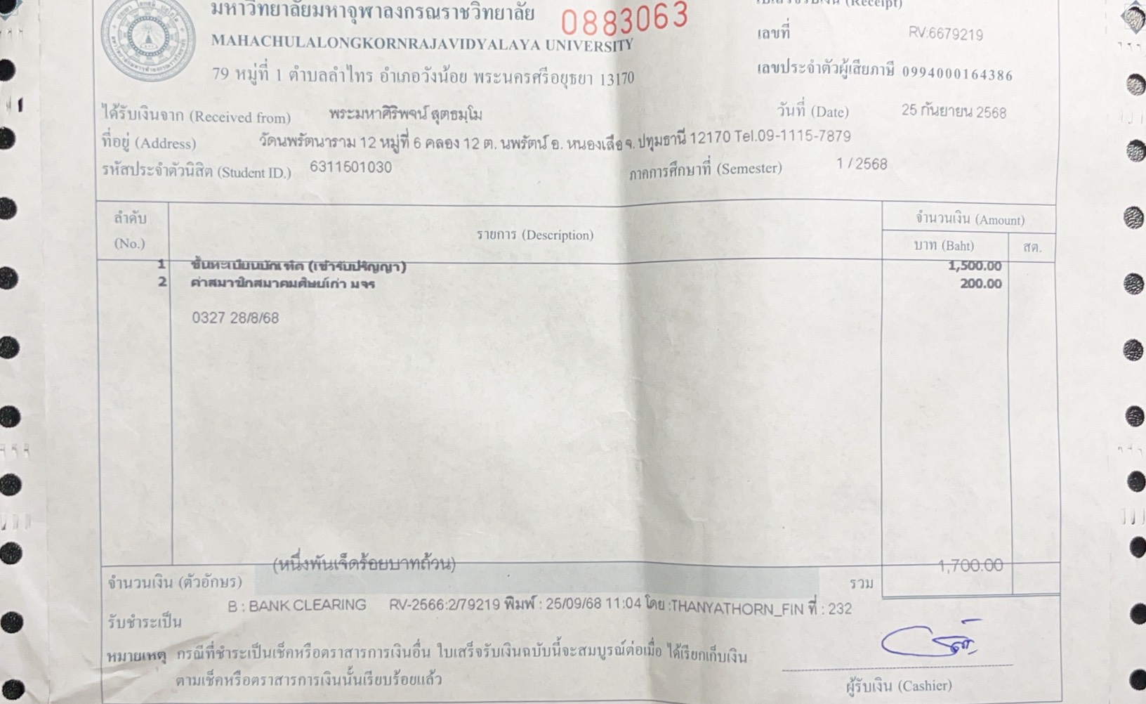 | สถานะเข้าพิธีประสาทปริญญา : บรรพชิต | ระดับ : ปริญญาตรี | สังกัดคณะ: คณะพุทธศาสตร์ | สาขาวิชา: พระพุทธศาสนา |