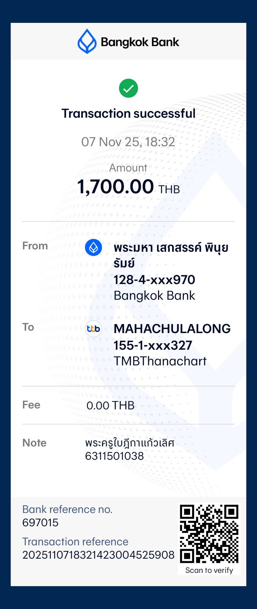 | สถานะเข้าพิธีประสาทปริญญา : บรรพชิต | ระดับ : ปริญญาตรี | สังกัดคณะ: คณะพุทธศาสตร์ | สาขาวิชา: พระพุทธศาสนา |