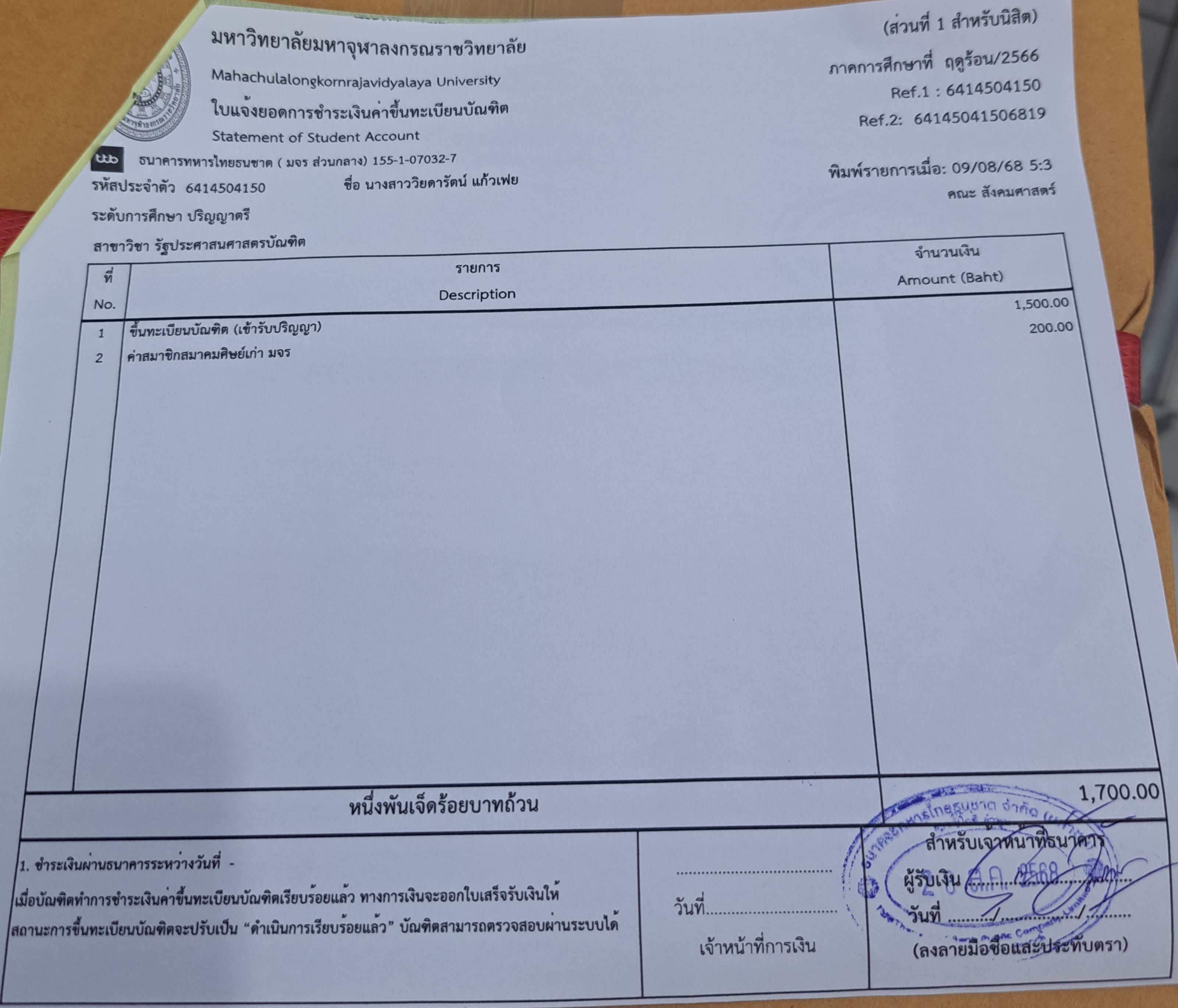 สถานะเข้าพิธีประสาทปริญญา : คฤหัสถ์ ระดับ : ปริญญาตรี สังกัดคณะ: คณะสังคมศาสตร์ สาขาวิชา: รัฐประศาสนศาสตรบัณฑิต