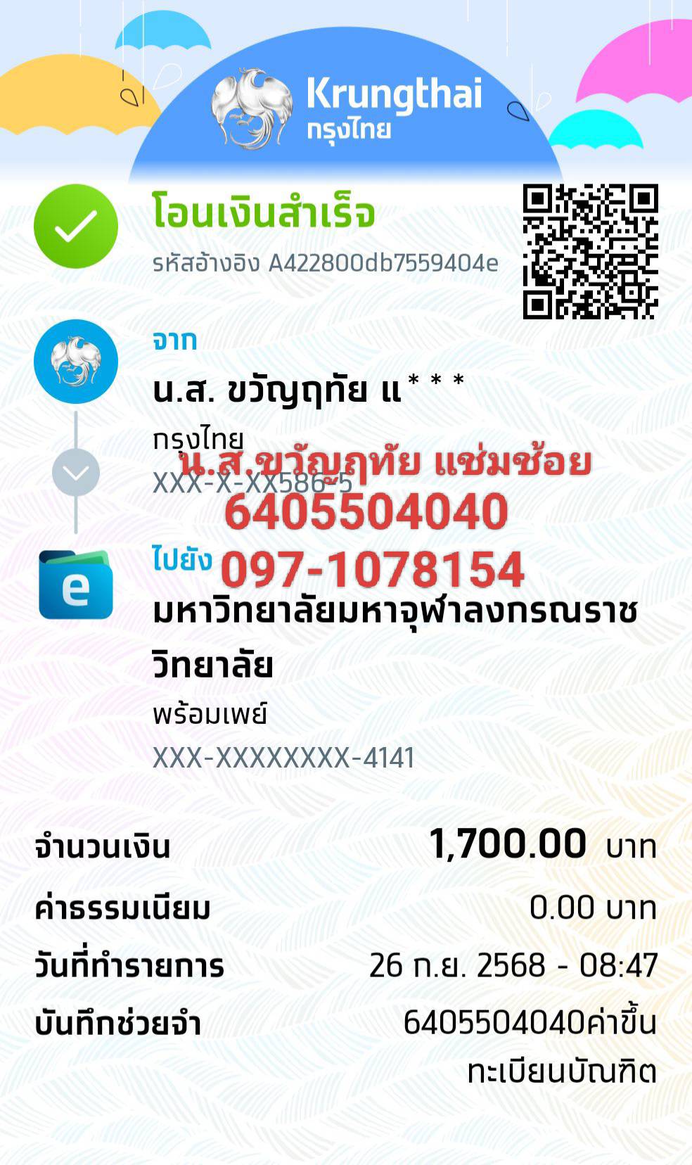 | รหัสนิสิต : 6405504040 | ชื่อ : นางสาวขวัญฤทัย | ฉายา: - | นามสกุล: แช่มช้อย |
