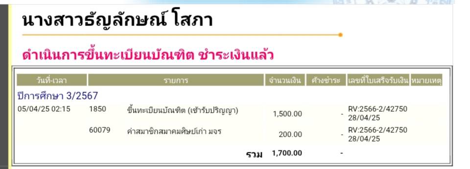| รหัสนิสิต : 6416504504 | ชื่อ : นางสาวธัญลักษณ์ | ฉายา: - | นามสกุล: โสภา |