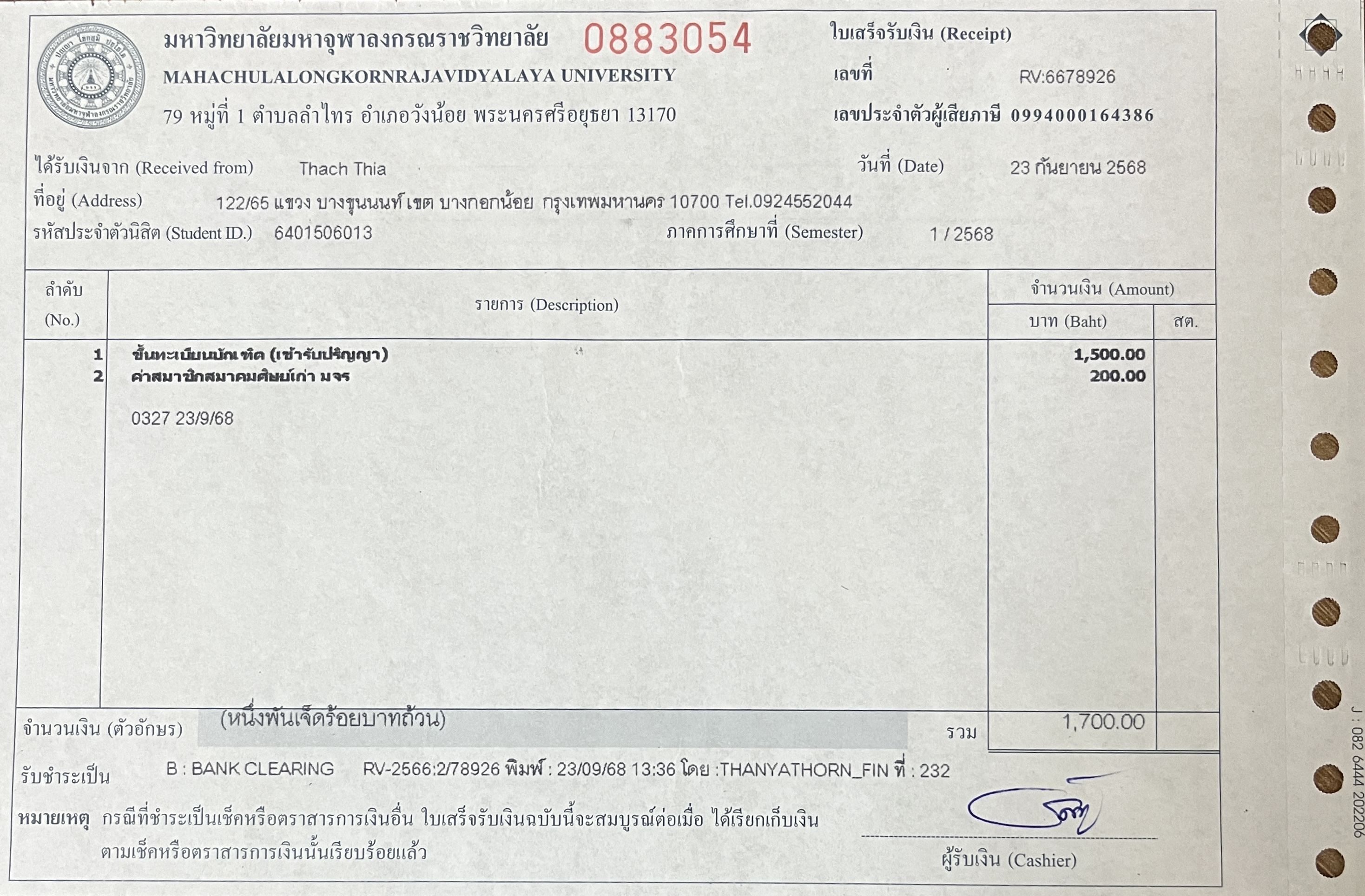 | รหัสนิสิต : 6401506013 | ชื่อ : Thach Thia | ฉายา: - | นามสกุล: - |