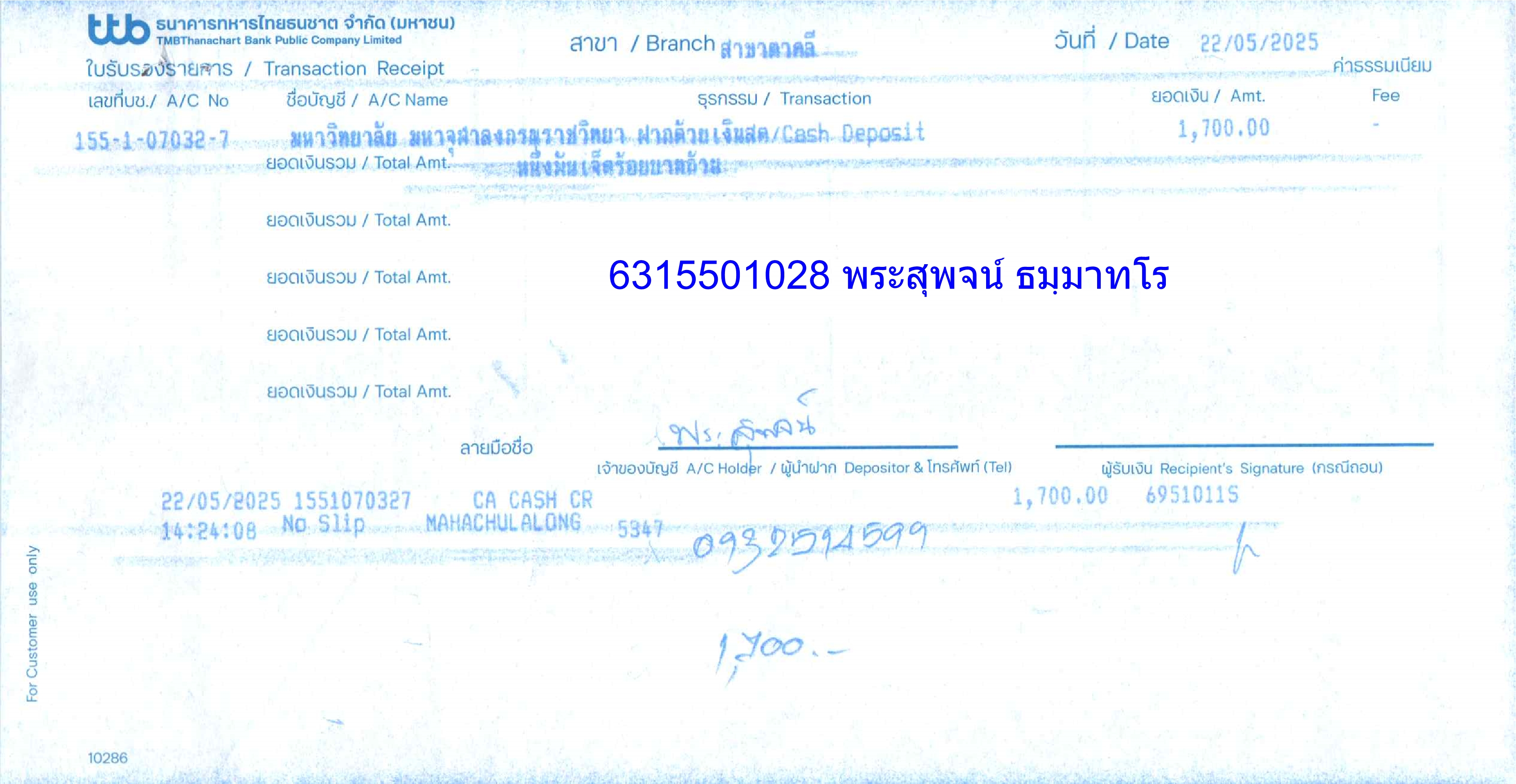 ใบเสร็จรับเงิน/เอกสารยืนยันการชำระเงิน(แนบเอกสาร)