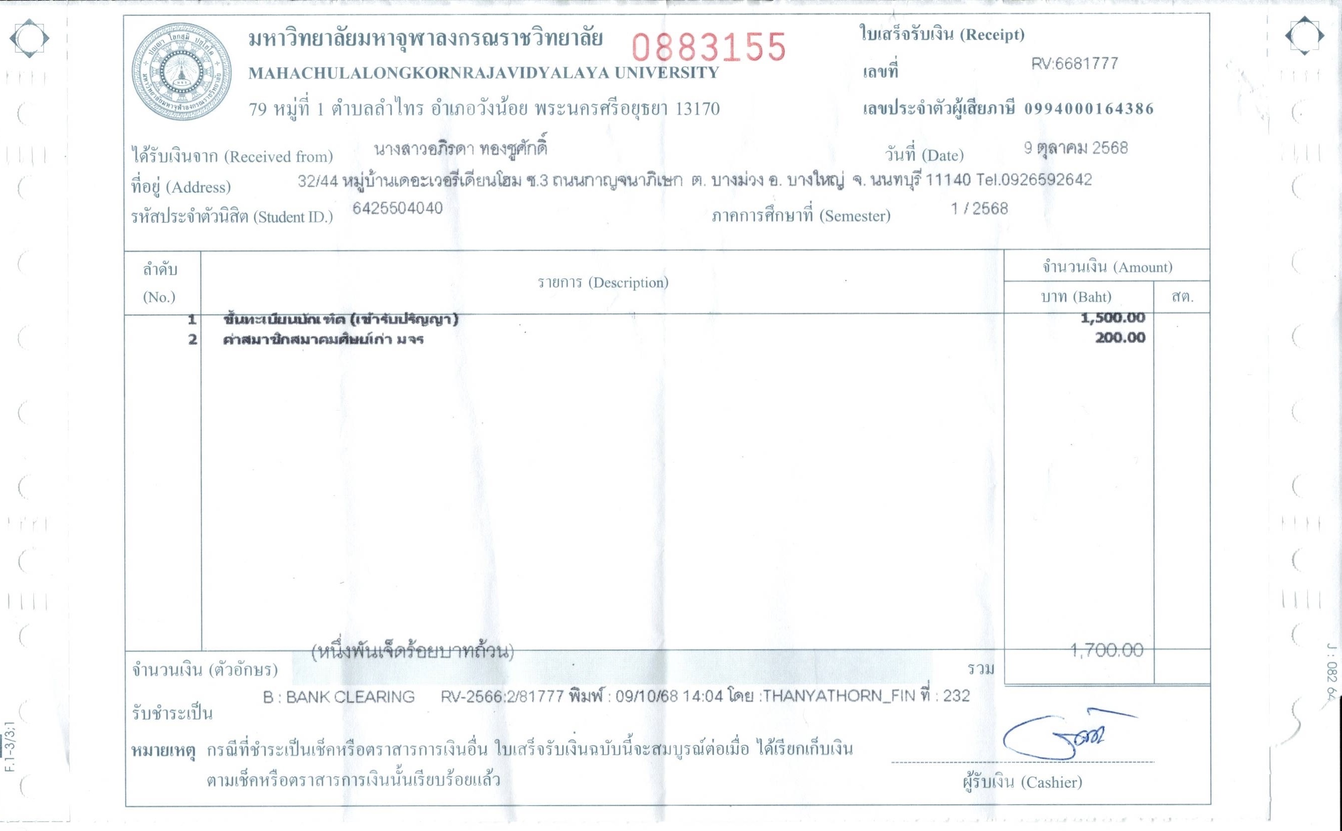 | รหัสนิสิต : 6425504040 | ชื่อ : นางสาวอภิรดา | ฉายา: - | นามสกุล: ทองชูศักดิ์ |
