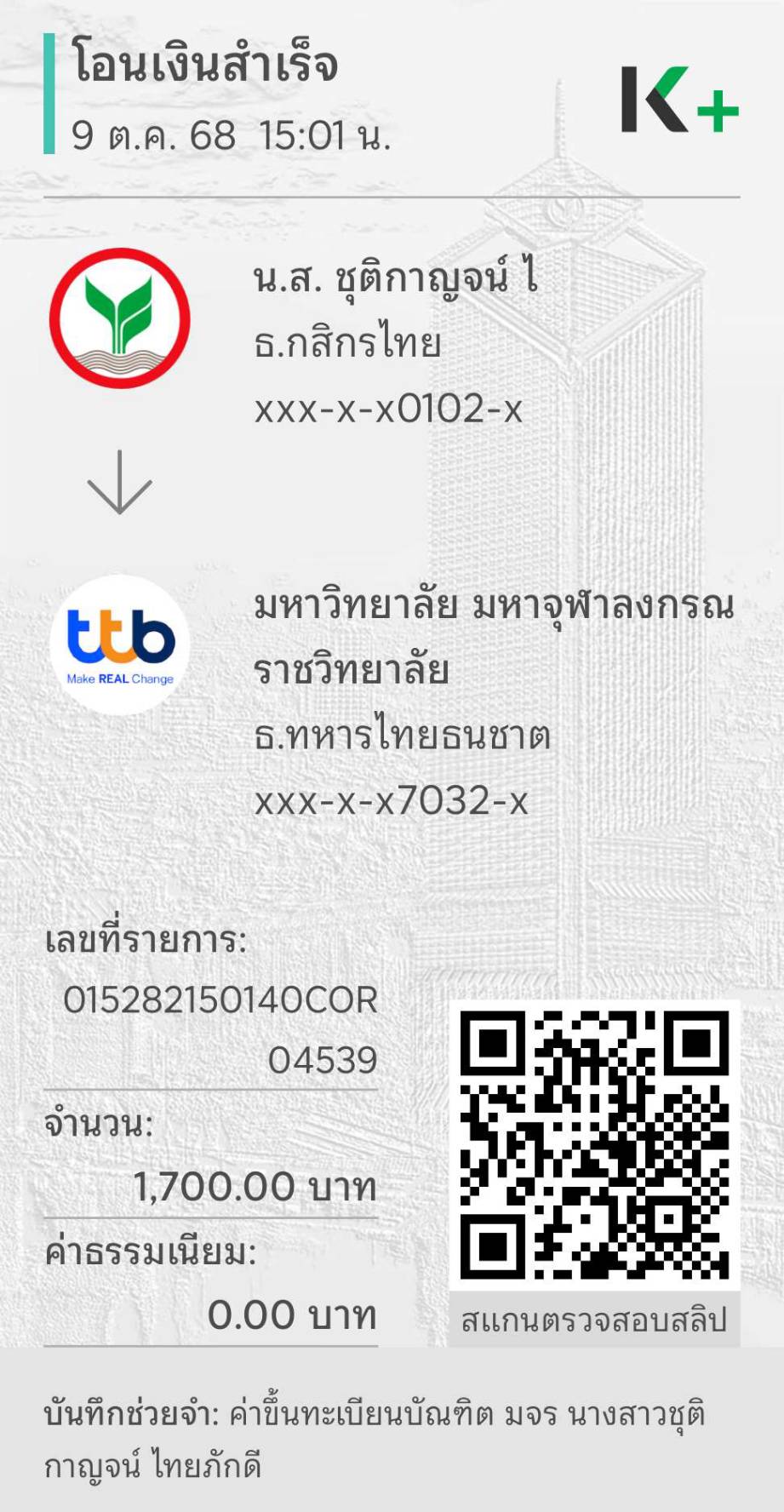 | รหัสนิสิต : 6525404007 | ชื่อ : นางสาวชุติกาญจน์ | ฉายา: - | นามสกุล: ไทยภักดี |