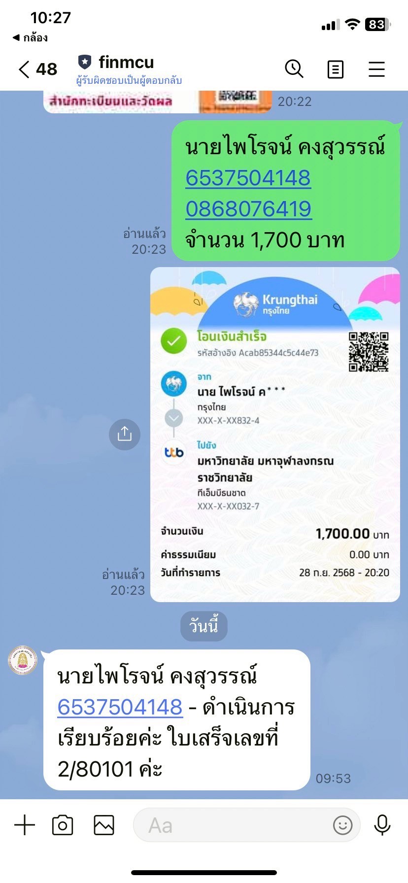 | รหัสนิสิต : 6537504148 | ชื่อ : นายไพโรจน์ | ฉายา: - | นามสกุล: คงสุวรรณ์ |